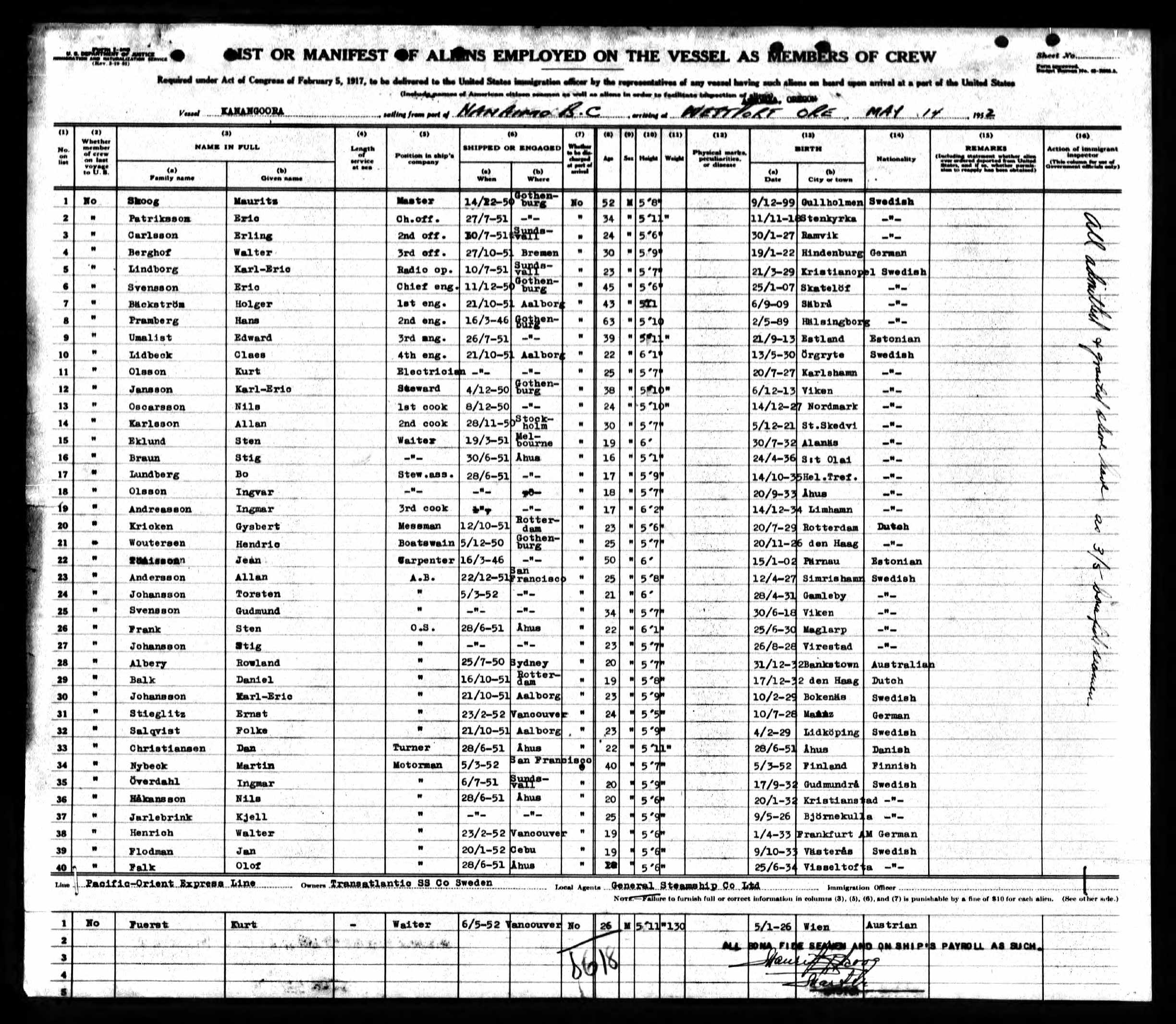 Född 1927-12-14. Död Ombord på fartyg. 1954-11-05. Hotellvaktmästare 1943 1 . Portierbiträde 1945-09-17 i Varberg (N) 2 . Kock Kock på fartyg Kanangoora 1952-05-14 3 . |